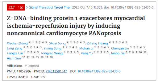 Zhang X, Song S, Huang Z, Zeng L, Song Y, Li M, Liu C, Cai F, Wang T, Yu P, Ge J, Sun A. Z-DNA-binding protein 1 exacerbates myocardial ischemia‒reperfusion injury by inducing noncanonical cardiomyocyte PANoptosis. Signal Transduct Target Ther. 2025 Oct 7;10(1):333. doi: 10.1038/s41392-025-02430-5. PMID: 41052986; PMCID: PMC12501347.