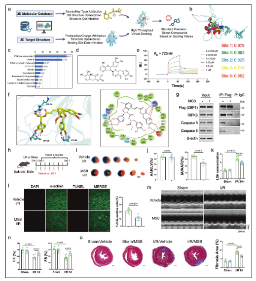 通过结构虚拟筛选,研究者发现小分子MSB可与ZBP1蛋白结合(KD = 725 nM),并有效阻断其与RIPK3、CASP8、CASP6的相互作用。体外实验中,MSB显著减少H/R诱导的心肌细胞死亡,包括PI染色阳性细胞数、LDH释放和CASP3活性。在小鼠I/R模型中,MSB预处理显著减少心肌梗死面积、血清LDH水平和TUNEL阳性细胞数。7天后的心脏功能评估显示,MSB可改善射血分数EF并减少心肌纤维化。上述结果表明,MSB通过靶向ZBP1阻断PANoptosome组装,具有良好的心肌保护作用,展现出潜在的临床应用价值。