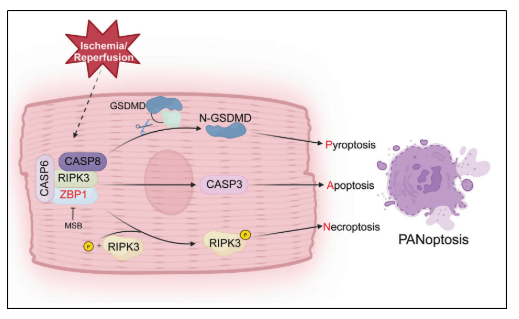 心肌缺血再灌注(I/R)损伤是心肌梗死再灌注治疗中常见且严重的并发症,其主要表现为心肌细胞死亡,进而导致心脏功能障碍和心力衰竭。尽管已有研究关注细胞凋亡、坏死、焦亡、铁死亡等多种程序性细胞死亡形式,但单一通路干预往往效果有限。近年来,PANoptosis(泛程序性细胞死亡)作为一种整合多种细胞死亡通路的新型死亡模式被提出,其由PANoptosome复合物调控,涉及焦亡、凋亡和坏死通路的关键分子。