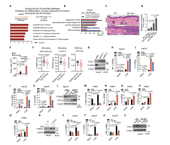 研究通过RNA-seq和体内外实验证实YTHDF2是炎症的关键负调控因子。在人类角质形成细胞中敲低YTHDF2会显著上调TNF、IL-17和TLR3等炎症通路相关基因。在构建的皮肤特异性YTHDF2敲除小鼠模型中,UVB照射诱导了更严重的皮肤炎症,表现为表皮增厚、CD45+免疫细胞浸润增加。在细胞水平,敲低YTHDF2增强了UVB诱导的TNF-α、IL-6、COX-2等关键炎症因子的表达,而过表达YTHDF2则抑制这一过程。此外,临床数据分析发现,YTHDF2在系统性红斑狼疮和I型糖尿病患者中表达下调。这些结果共同确立了YTHDF2在抑制炎症反应中的核心地位。