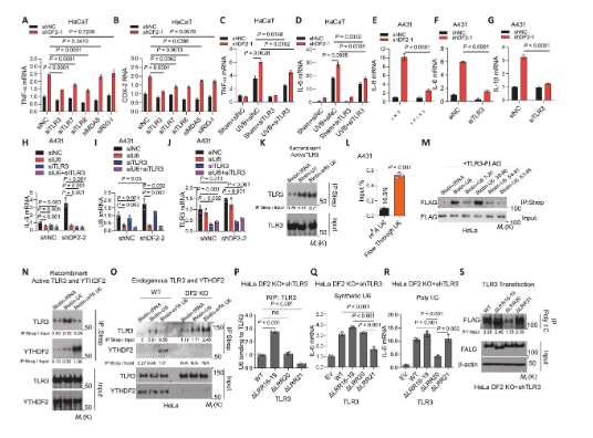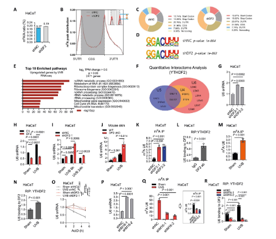 同时,慢性炎症是多种癌症的关键驱动因素,而紫外线(UVB)是诱导皮肤炎症和皮肤癌的主要环境因素。尽管已知Toll样受体3(TLR3)能识别外源双链RNA引发免疫反应,但其如何被内源性RNA激活并参与肿瘤发生,机制尚不明确。本研究正是在此背景下,探索m⁶A修饰的自我非编码RNA(以U6 snRNA为代表)是否以及如何通过YTHDF2阅读蛋白,调控天然免疫应答和肿瘤发生,从而连接表观转录组学、炎症与肿瘤三大领域。