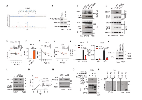 研究揭示了UVB通过翻译后修饰和蛋白降解两条路径抑制YTHDF2功能。质谱分析发现UVB照射后YTHDF2第39位丝氨酸发生去磷酸化。Co-IP实验表明,去磷酸化削弱了YTHDF2与CNOT1(介导RNA降解的关键因子)的互作,并增强了与磷酸酶亚基MYPT1的互作,从而解释了其功能失活。同时,UVB通过激活自噬降解YTHDF2蛋白,这一过程依赖于自噬受体p62。敲低自噬关键基因ATG5/7或p62,均可阻止UVB引起的YTHDF2下调及U6累积。这些发现阐明了环境应激如何通过破坏YTHDF2的稳定性和功能,导致U6累积并最终引发炎症。