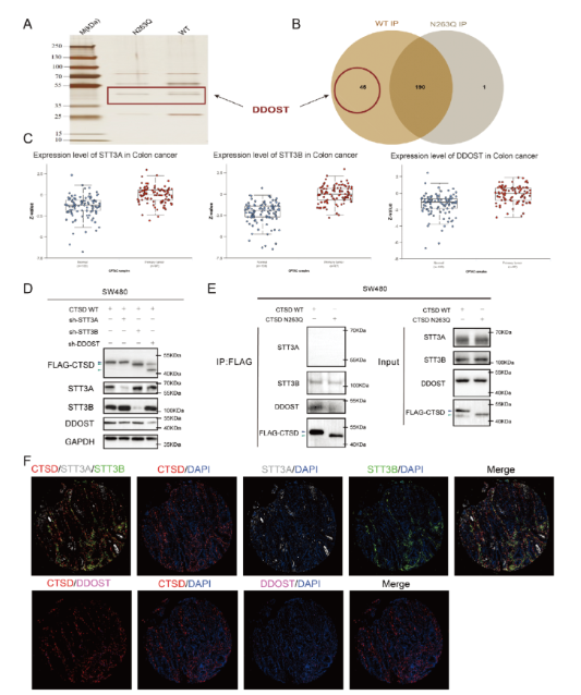 免疫共沉淀富集与CTSD结合的蛋白,随后通过质谱分析鉴定这些蛋白。分析结果显示,235个蛋白与CTSD WT相互作用,191个蛋白与CTSD N263Q结合。在与CTSD WTwan全相互作用的45个蛋白中,DDOST(也称为OST48)是wei一的N-糖基转移酶,可能参与残基263的N-糖基化修饰。最初的N-糖基转移酶,也被称为寡糖转移酶复合物(OST),由多个蛋白质组成一个复合物。OST以OST-A和OST-B两种形式存在,分别以STT3A和STT3B为催化亚基,分别负责初始N-糖基化。催化亚基能够独立完成N-糖基化加成过程。然而,在某些情况下,需要各种非催化亚基,如DDOST,在此过程中与底物形成稳定的配合物我们利用在线蛋白质组学数据库CPTAC研究了STT3A、STT3B和DDOST在结肠癌组织和配对正常组织中的表达水平,发现这3种蛋白在结肠癌组织中表达上调。靶向敲除STT3A、STT3B和DDOST:当STT3B和DDOST的表达减少时,CTSD的分子量相对于阴性对照显著降低,表明从N-糖基化向非N-糖基化转变。这些发现表明,CTSD残基263的N-糖基化可能受到DDOST的调控,STT3B可能是该位点的催化亚基。