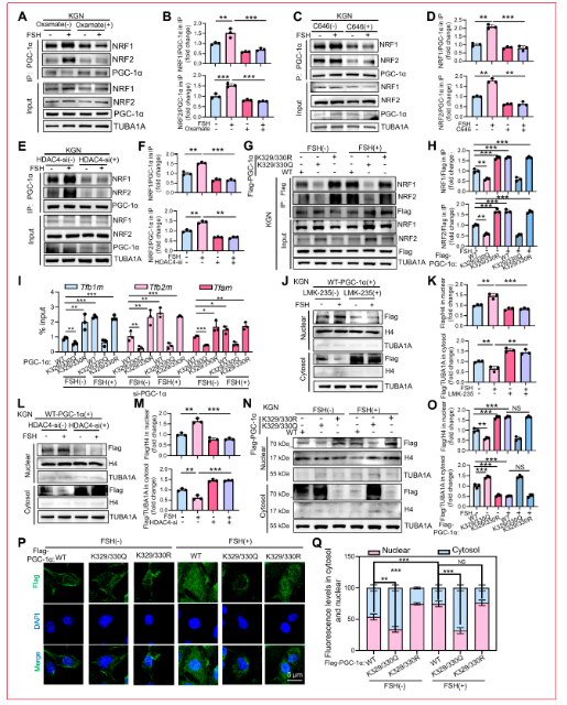 PGC-1α作为线粒体生物发生的主调节因子,协同转录因子如NRF1和GABPA(NRF2)激活线粒体功能所需的核基因。为确定K329/330乙酰化如何影响PGC-1α活性,研究人员通过co-IP检查FSH依赖性变化。FSH刺激显著增强PGC-1α与NRF1/NRF2的相互作用,而破坏乳酸依赖性H4K5la消除这一效应。类似地,暴露于P300/CBP抑制剂C646或HDAC4耗竭显著减弱KGN细胞中FSH诱导的PGC-1α-NRF1/2复合物形成。为评估K329/330乙酰化的功能意义,研究人员在KGN细胞中表达Flag标记的PGC-1α变体(WT、乙酰化缺陷K329/330R或乙酰化模拟K329/330Q)。K329/330R突变增强FSH刺激下PGC-1α与NRF1/NRF2的结合,而K329/330Q变体显著损害这些相互作用。与此一致,ChIP-qPCR显示FSH处理细胞中K329/330R突变体对NRF1/NRF2靶基因(TFAM、TFB1M、TFB2M)启动子的占据增加,而K329/330Q突变体染色质结合显著降低。这些结果共同表明PGC-1α在K329/330的去乙酰化促进其招募至NRF1/2并驱动响应FSH的线粒体基因程序激活。PGC-1α必须从细胞质转位至细胞核以发挥转录辅激活因子功能。为确定乙酰化是否调节其亚细胞分布,研究人员用Flag标记的WT PGC-1α转染KGN细胞并进行核-胞质分级分离。FSH处理诱导PGC-1α强烈的核定位,而LMK-235抑制HDAC4或HDAC4特异性siRNA减弱这一核积累。为进一步探究K329/330乙酰化的作用,研究人员表达WT、K329/330R或K329/330Q PGC-1α构建体后进行亚细胞分级分离。K329/330R突变体增强FSH刺激的PGC-1α核进入,而K329/330Q突变体减弱核定位。免疫荧光染色证实这些结果,显示FSH处理细胞中K329/330R变体的胞质-核转位增加和K329/330Q突变体的核-胞质重新分布增强。这些发现表明FSH降低PGC-1α乙酰化,促进其核进入并增强线粒体生物发生。