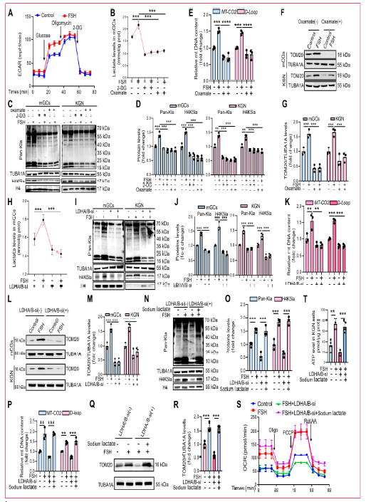 研究人员通过腹腔注射FSH评估其对小鼠卵巢颗粒细胞(mGCs)线粒体生物发生的影响。结果显示,FSH刺激增加了mGCs中线粒体DNA编码的细胞se素c氧化酶II(MT-CO2)基因和mtDNA D-loop区域的拷贝数,线粒体标志物TOM20水平升高。透射电镜进一步显示FSH显著增加mGCs中线粒体数量,同时保持超微结构完整性,包括膜形态和嵴组织,线粒体体积也增加,提示FSH暴露后线粒体融合增强。FSH处理还显著上调线粒体融合蛋白MFN1、MFN2和OPA1表达,而裂变蛋白DRP1及其Ser616磷酸化水平降低,Ser637磷酸化增加,表明线粒体裂变受抑制。FSH处理还显著提高了mGCs中ATP水平。由于FSH在卵泡发育过程中增加糖酵解导致乳酸升高,研究人员评估了乳酸是否促进FSH介导的线粒体生物发生。FSH注射后,mGCs表现出显著增加的葡萄糖转运蛋白1(GLUT1)表达和乳酸水平。免疫组织化学显示FSH处理后卵巢组织中乳酸化显著增加,主要定位于mGCs。质谱分析鉴定出组蛋白H4第5位赖氨酸(H4K5)的乳酸化,免疫组织化学染色显示H4K5la在颗粒细胞中特异性富集,而卵母细胞和膜细胞信号极弱。这些发现表明乳酸衍生的H4K5la可能作为FSH诱导的mGCs线粒体生物发生的表观遗传介质。