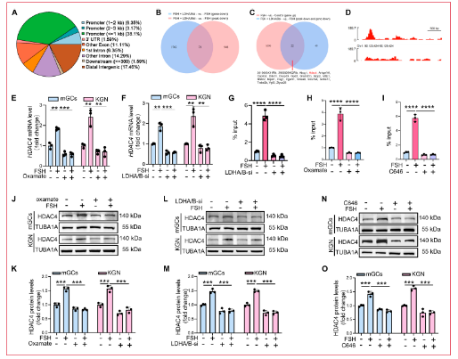 为评估组蛋白乳酸化对FSH激活颗粒细胞中基因表达的影响,研究人员使用H4K5la特异性抗体进行CUT&Tag分析。质量控制分析证实样本间高相关性和适当的DNA片段大小分布。H4K5la峰主要富集于启动子区域。GO分析显示H4K5la靶基因在mGCs中强烈富集于代谢调控,而KEGG通路注释同样显示在代谢网络中富集,表明组蛋白乳酸化有助于线粒体生物发生的基础代谢基因表达调控。为检查功能后果,研究人员对LDHA/LDHB敲低后的FSH处理mGCs进行RNA测序。差异表达分析显示与FSH处理对照相比,FSH + LDHA/B-si组中有1,773个下调基因和1,335个上调基因。下调基因的KEGG富集指向核心代谢过程,表明乳酸依赖性乳酸化支持线粒体生物发生的基础代谢基因表达。通过整合CUT&Tag数据(下调的H4K5la峰)与FSH处理GCs ± LDHA/B敲低的RNA-seq数据(下调基因),研究人员鉴定出71个H4K5la靶基因,其转录在LDHA/B耗竭后显著降低。为进一步将FSH诱导的H4K5la与线粒体生物发生联系起来,研究人员分析了FSH处理mGCs的RNA-seq谱,鉴定出2,003个下调和1,718个上调基因。KEGG分析显示上调转录本与线粒体生物发生通路密切相关。将这些基因与71个差异表达基因交叉参考,鉴定出22个被FSH显著诱导且在LDHA/LDHB敲低后显著下调的H4K5la靶基因。在这些基因中,HDAC4(一种作为乙酰化而非乳酸化擦除器的HDAC II类去乙酰化酶)在其启动子处显示强烈的H4K5la富集。与此发现一致,qRT-PCR证实FSH刺激的mGCs和KGN细胞中草氨酸盐处理或LDHA/LDHB敲低后HDAC4 mRNA表达降低。ChIP-qPCR进一步验证了FSH刺激下HDAC4启动子处的H4K5la富集,该富集被草氨酸盐、LDHA/B沉默或使用C646抑制乳酸化写入蛋白P300所减弱。免疫印迹显示草氨酸盐、LDHA/LDHB敲低或C646处理后HDAC4蛋白降低。免疫荧光染色证实抑制乳酸产生和H4K5la降低HDAC4蛋白表达,HDAC4主要定位于细胞核。这些结果共同确立FSH诱导的H4K5la驱动颗粒细胞中HDAC4的转录上调。