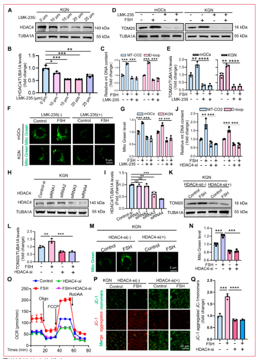 在确立H4K5la调控HDAC4表达后,研究人员接下来研究了HDAC4在FSH处理颗粒细胞中的功能作用。使用LMK-235(特异性IIa类去乙酰化酶家族拮抗剂,据报道可在转录和翻译水平抑制HDAC4表达)处理颗粒细胞。如预期,LMK-235处理后KGN细胞中HDAC4表达以浓度依赖性方式降低。基于这些结果,选择15 μM LMK-235作为后续实验的标准浓度。通过qRT-PCR定量线粒体DNA含量、线粒体标志物TOM20免疫印迹和MitoTracker Green染色线粒体证明,HDAC4的药理学抑制显著减弱FSH诱导的mGCs和KGN细胞线粒体生物发生。为最小化LMK-235与HDAC4抑制无关的潜在脱靶效应,研究人员随后采用siRNA介导的方法特异性沉默HDAC4。初步评估了四种靶向HDAC4的siRNA的基因沉默效率和特异性。FSH刺激下HDAC4敲低显著损害线粒体生物发生,表现为线粒体DNA拷贝数减少、TOM20蛋白水平降低和MitoTracker Green荧光减弱。与此一致,HDAC4耗竭抑制KGN细胞中FSH诱导的OCR和ΔΨm增加。这些结果牢固确立HDAC4作为颗粒细胞响应FSH的线粒体生物发生关键调节因子。