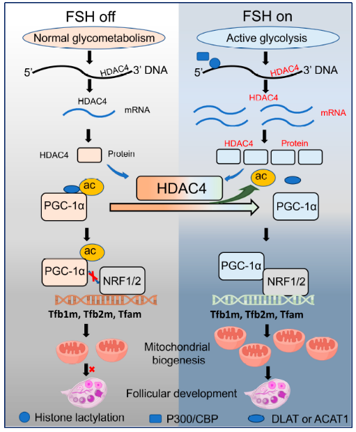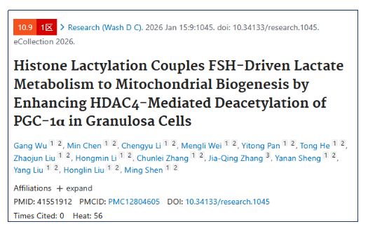 Wu G, Chen M, Li C, Wei M, Pan Y, He T, Liu Z, Li H, Zhang C, Zhang JQ, Sheng Y, Liu Y, Liu H, Shen M. Histone Lactylation Couples FSH-Driven Lactate Metabolism to Mitochondrial Biogenesis by Enhancing HDAC4-Mediated Deacetylation of PGC-1α in Granulosa Cells. Research (Wash D C). 2026 Jan 15;9:1045. doi: 10.34133/research.1045. PMID: 41551912; PMCID: PMC12804605.