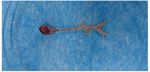 7、在体视显微镜下充分剔除主动脉周围多余的组织,注意不要伤害到血管,获取全主动脉。